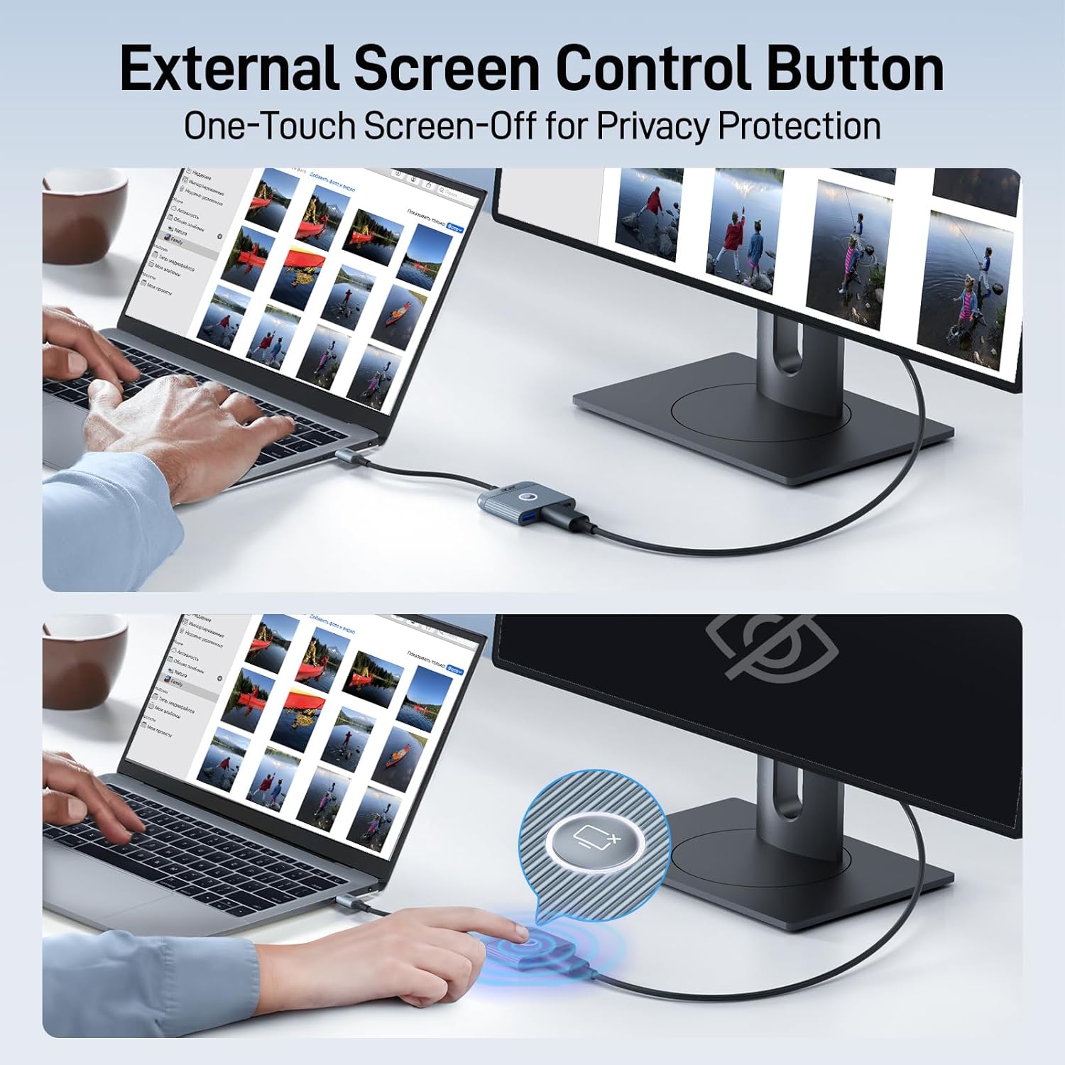 3-in-1 USB C HDMI Adapter – The Acer USB-C to HDMI adapter features three essential ports: 4K@60Hz HDMI, 100W PD fast charging, and USB 3.0, providing seamless connectivity for your devices. The screen control button lets you effortlessly switch display status, ensuring privacy protection when needed. Perfect for presentations, meetings, and multitasking [Note: The USB-A port does not support charging]