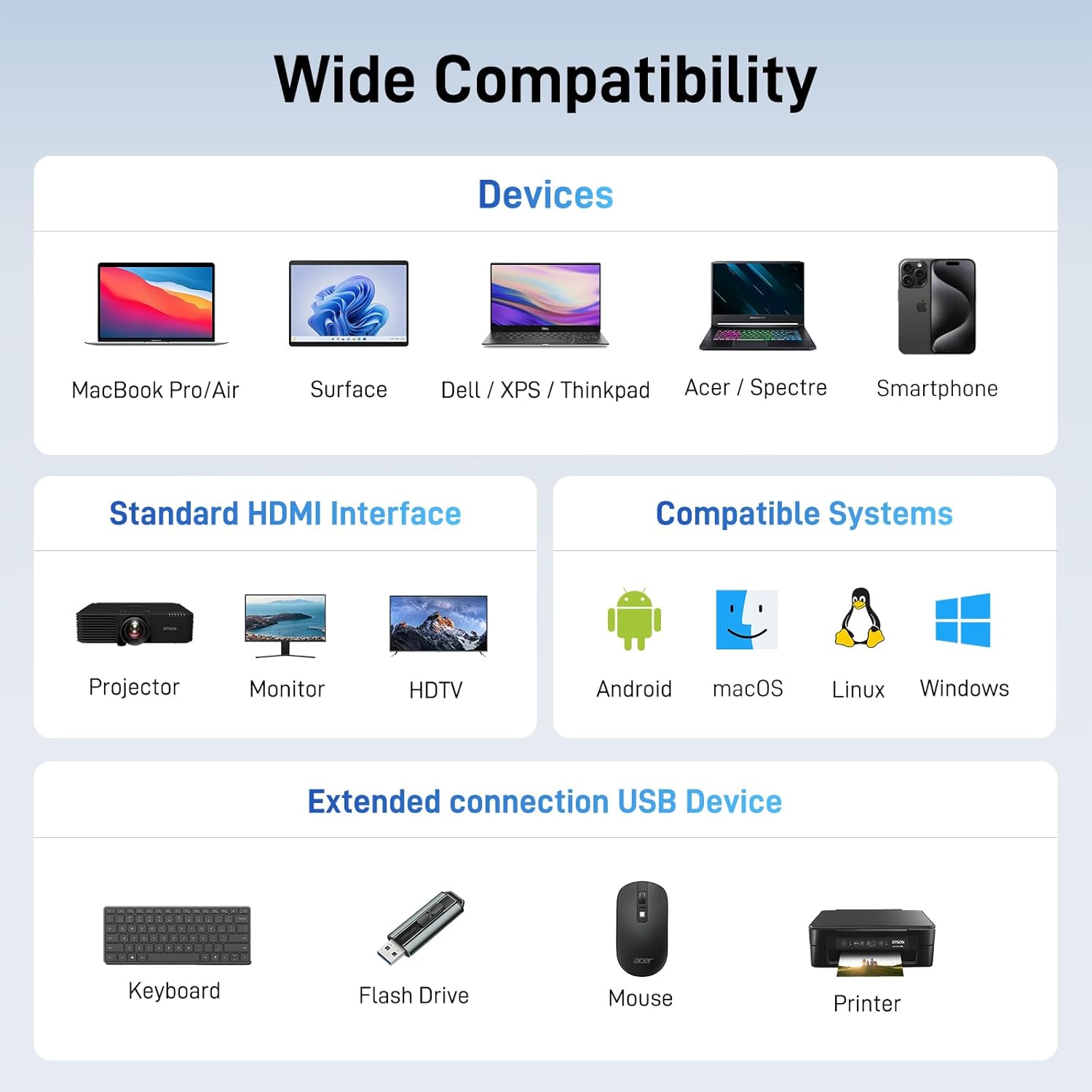 Wide Compatibility – Crafted with a durable aluminum body for enhanced heat dissipation, this USB-C hub is compatible with a broad range of devices, including MacBook Pro/Air, iPhone 16 Pro/Pro Max & iPhone 15 Pro/Pro Max, iPad Pro/Air, HP, Acer, Dell XPS, Surface, Steam Deck, and more. It also supports multiple operating systems, including Windows, ChromeOS, Linux, and macOS X 10.5 or later. [Not recommended for USB-C 2.0 ports (e.g., car navigation systems). Not compatible with Nintendo Switch or iPhone/iPad (Lightning Port)]