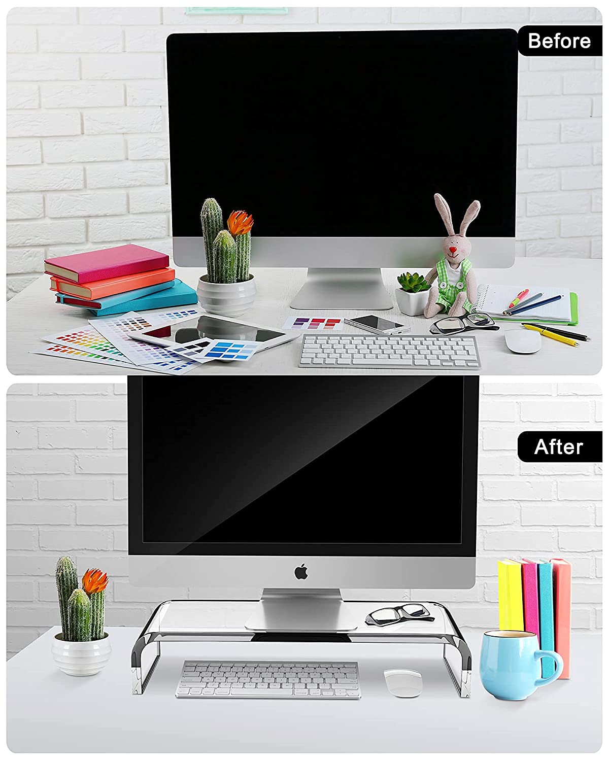 ✅ PROFESSIONAL LOOK. With its sparkling-clear acrylic design, this monitor stand is truly an attractive addition to any desk in a home or commercial office. Plus, it provides welcome storage space underneath for desktop essentials.