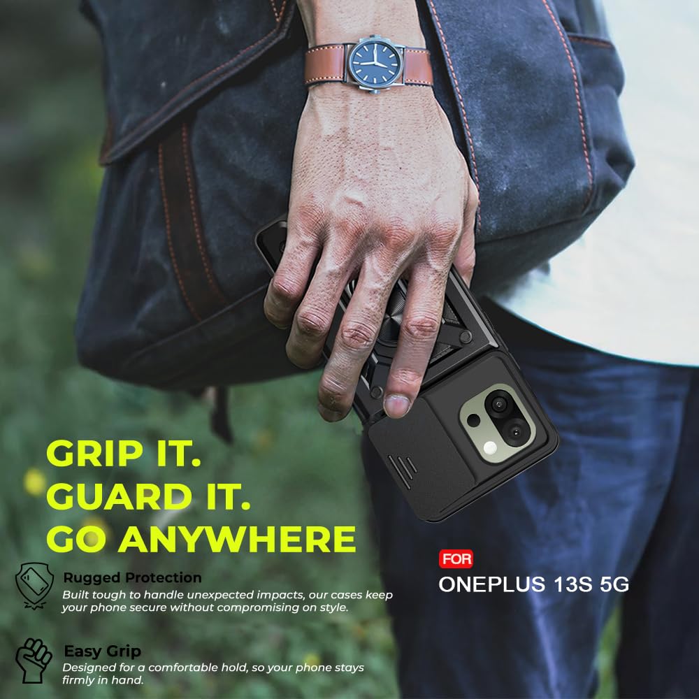 AESTMO Tough Armor OnePlus 13S 5G Bumper Back Case Cover | Ring Holder & Sliding Camera Shield Cover | 360 Degree Protection Back Case Cover for OnePlus 13S 5G (Black)