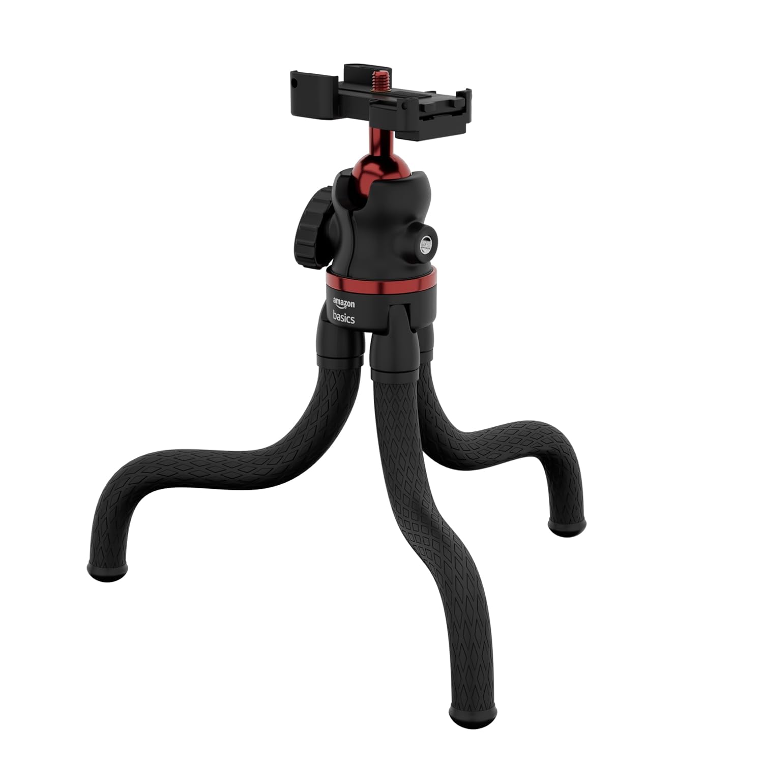 Amazon Basics Flexible Tripod with Hidden Phone Holder & Cold Shoe Mount | 360° Rotating Ball Head with Bubble Level | 1/4” Magic Arm Universal Screw for Smartphones & Cameras | Red