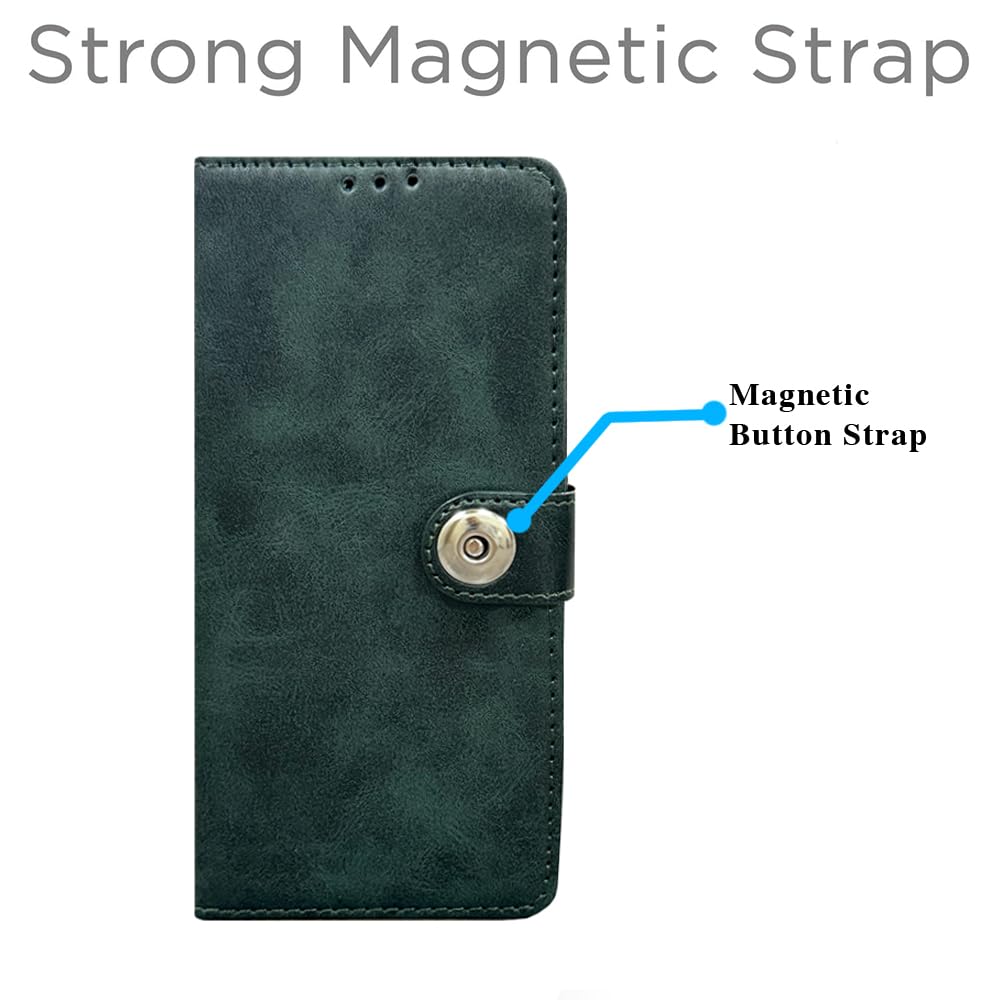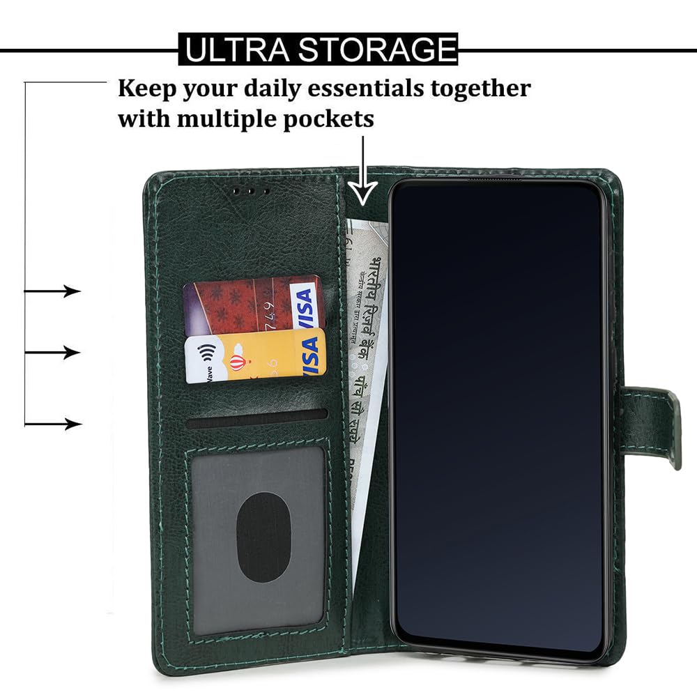 amazon basics Flip Cover Back Case for Redmi Note 14 5G | Genuine Leather Finish | Designer Button | Inbuilt Pockets & Stand | Flip Back Case (Button Green)