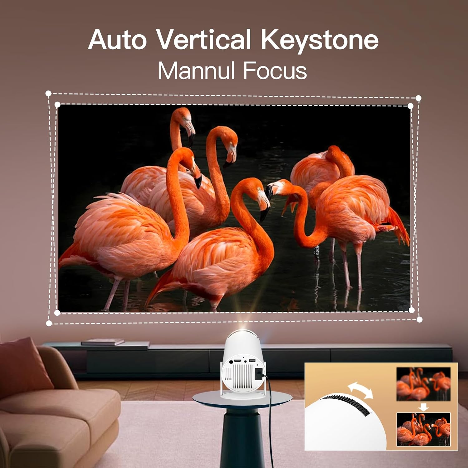 AUTOMATIC KEYSTONE & PORTABLE – Manual focus function, rotate to adjust, a handful of design, this small projector size 13 x 14 x 21 cm, compact and lightweight design, ideal for presentations on the go. 4D and 4P keystone correction technology, built-in sensors, you can quickly detect the motion of the projector and correct the image, no longer need to be remotely controlled or manually adjusted.