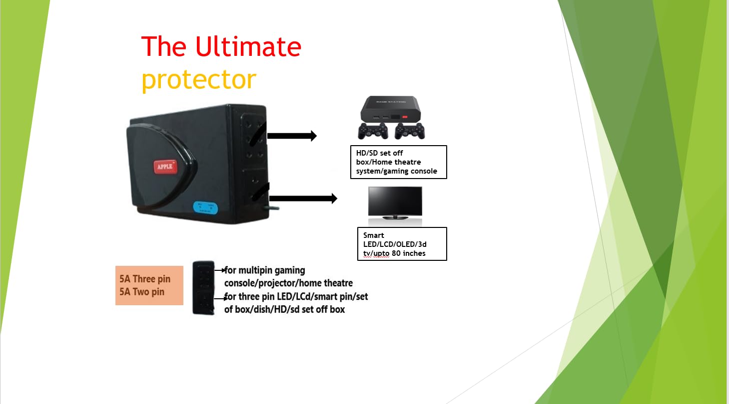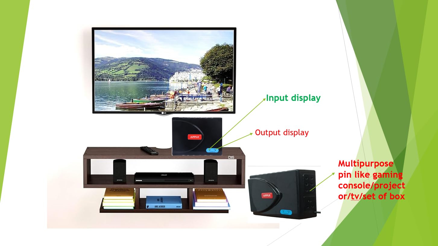 Application: Smart 4k tv , 3D, LED, LCD TV ,OLED up to 80 inch + HD or SD, DTH + Home Theater System , Gaming Console, Blu Ray player Power saving technology ,Copper Windings, Space-saving compact design High and low voltage management Black ABS cabinet with wall mounting facility, user-friendly status indication, 3 pin cable Capacity 1.5 Amps; 240 V Output, with output Voltage Correction