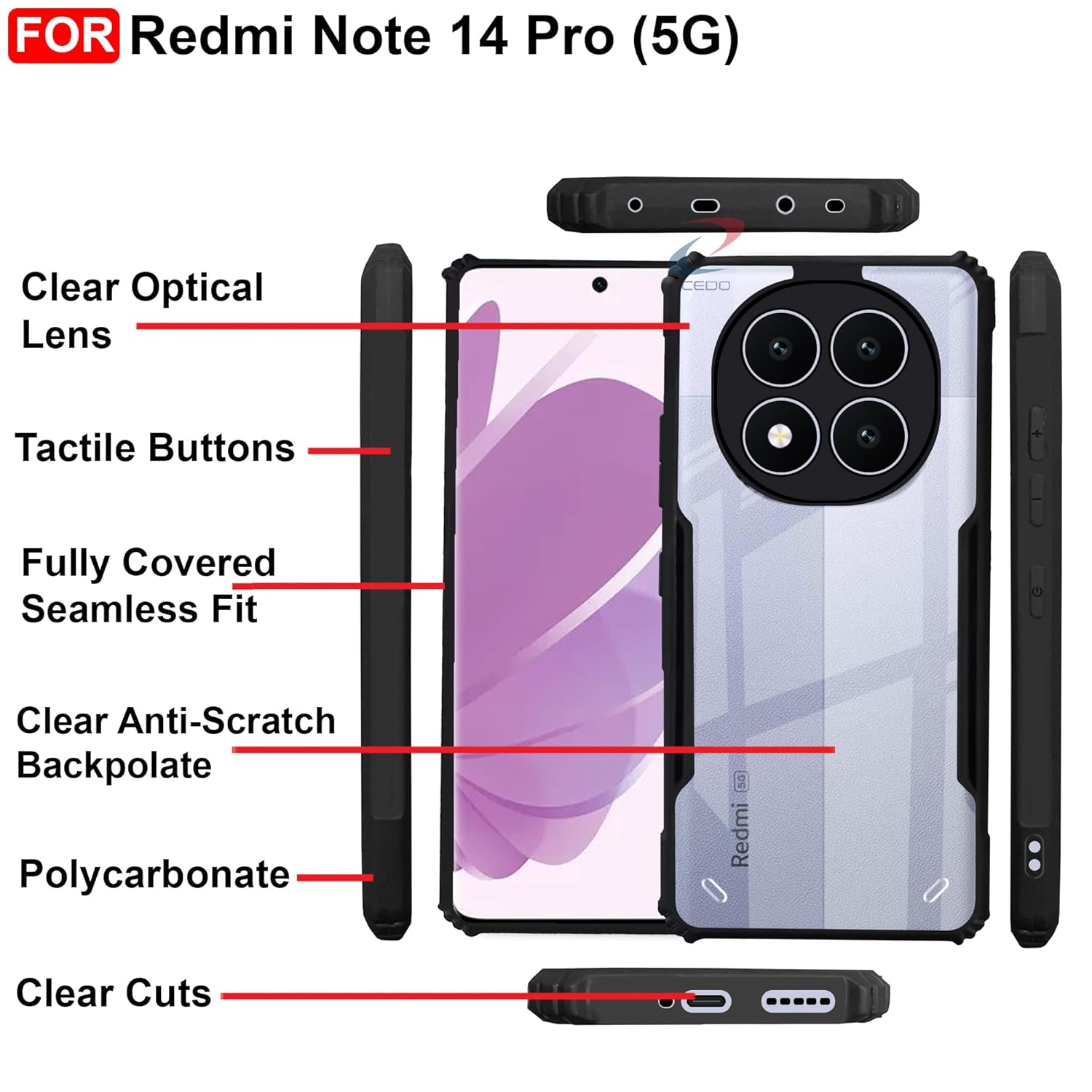 CEDO Redmi Note 14 Pro (5G) Back Case Cover | Camera Protection Shockproof Bumper-Edge | Acrylic Crystal Clear 360 Degree Protection TPU+PC | Transparent Eagle Back Case Cover (Black)