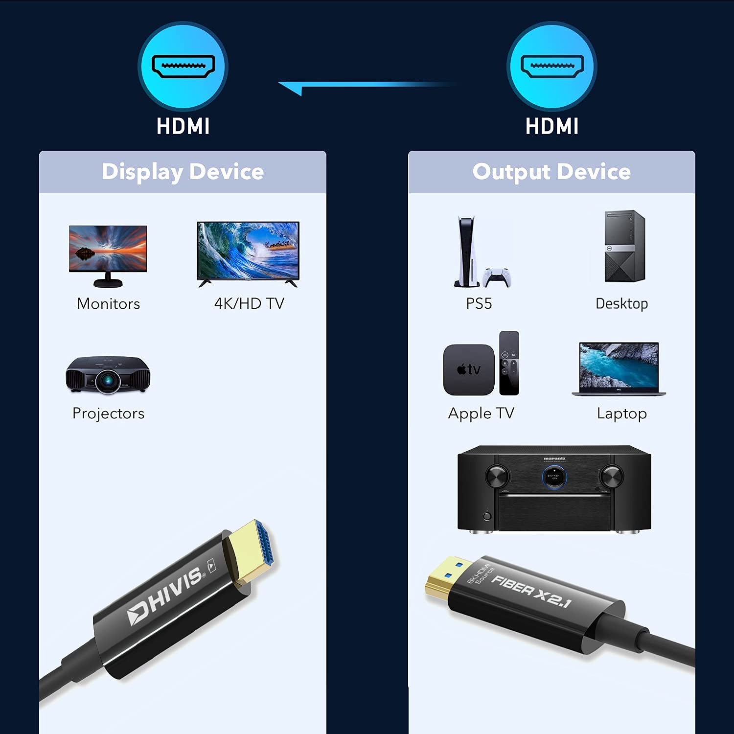 Dhivis Fiber X2.1 HDMI 8K Certified, 15M (Support RTX 3000) 4K@120hz & 8K – HDCP 2.2, 2.3, 48Gbps – HDR 10+ and Dolby Vision (Fiber X2.1 Series) Metal Armored HDMI Cable