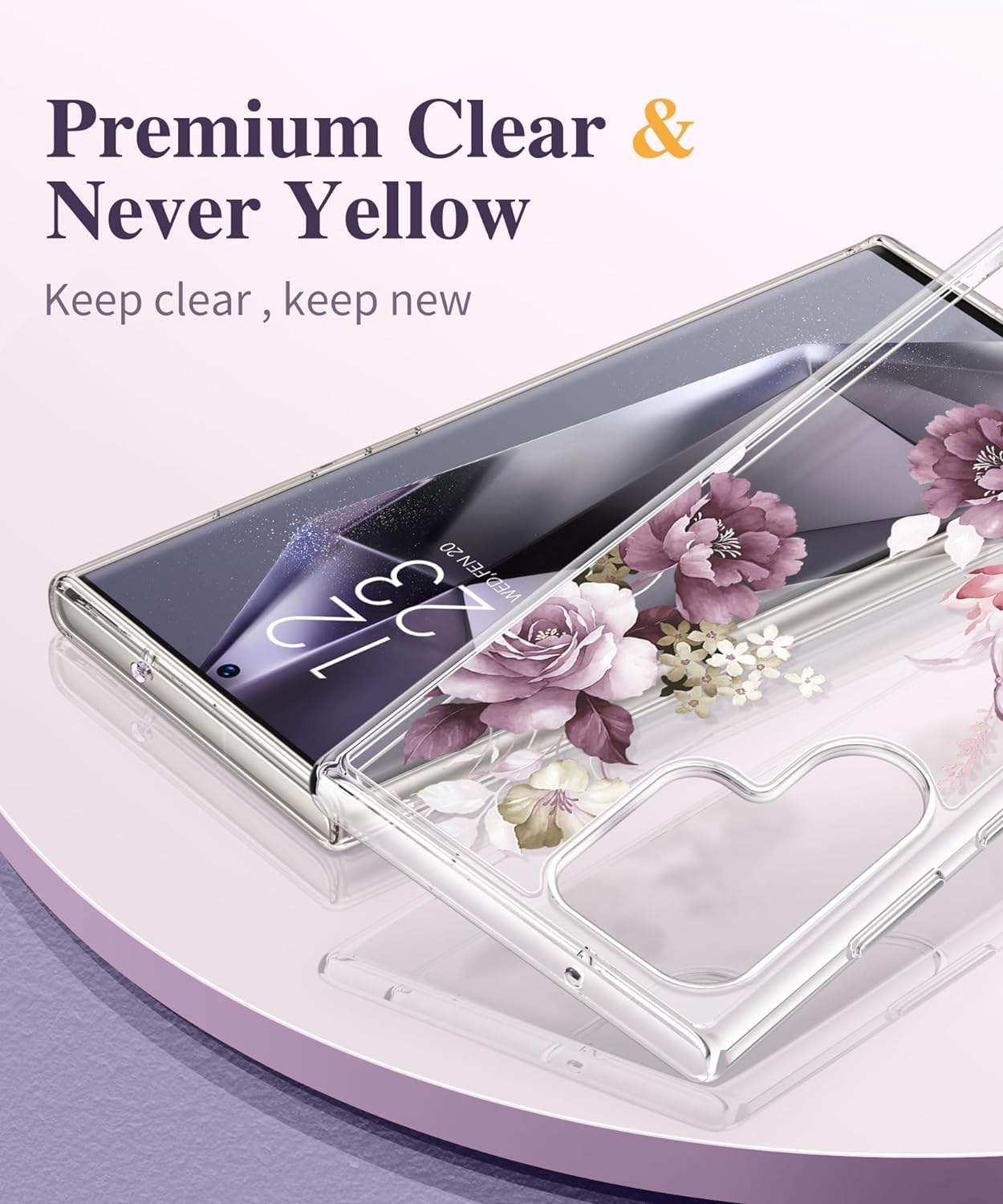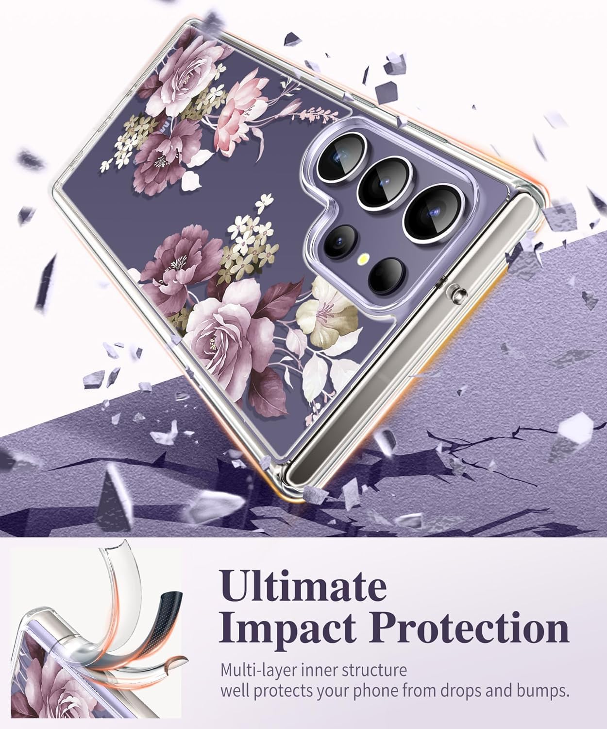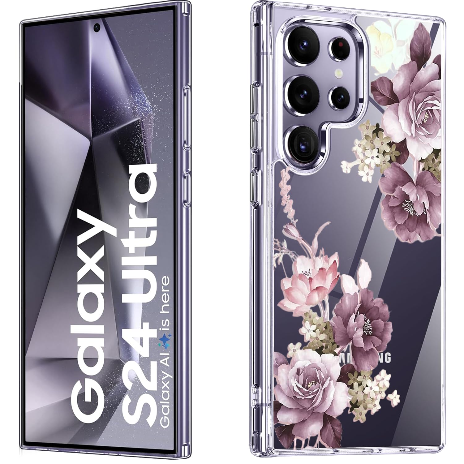 Elzzi Clear Transparent Flower Cover For Samsung S24 Ultra 5g Case Shockproof Case Floral Design Camera Protection Shockproof PC+TPU Transparent Flower Cover For Girls & Women 2024 6.8″ (Deep Purple)