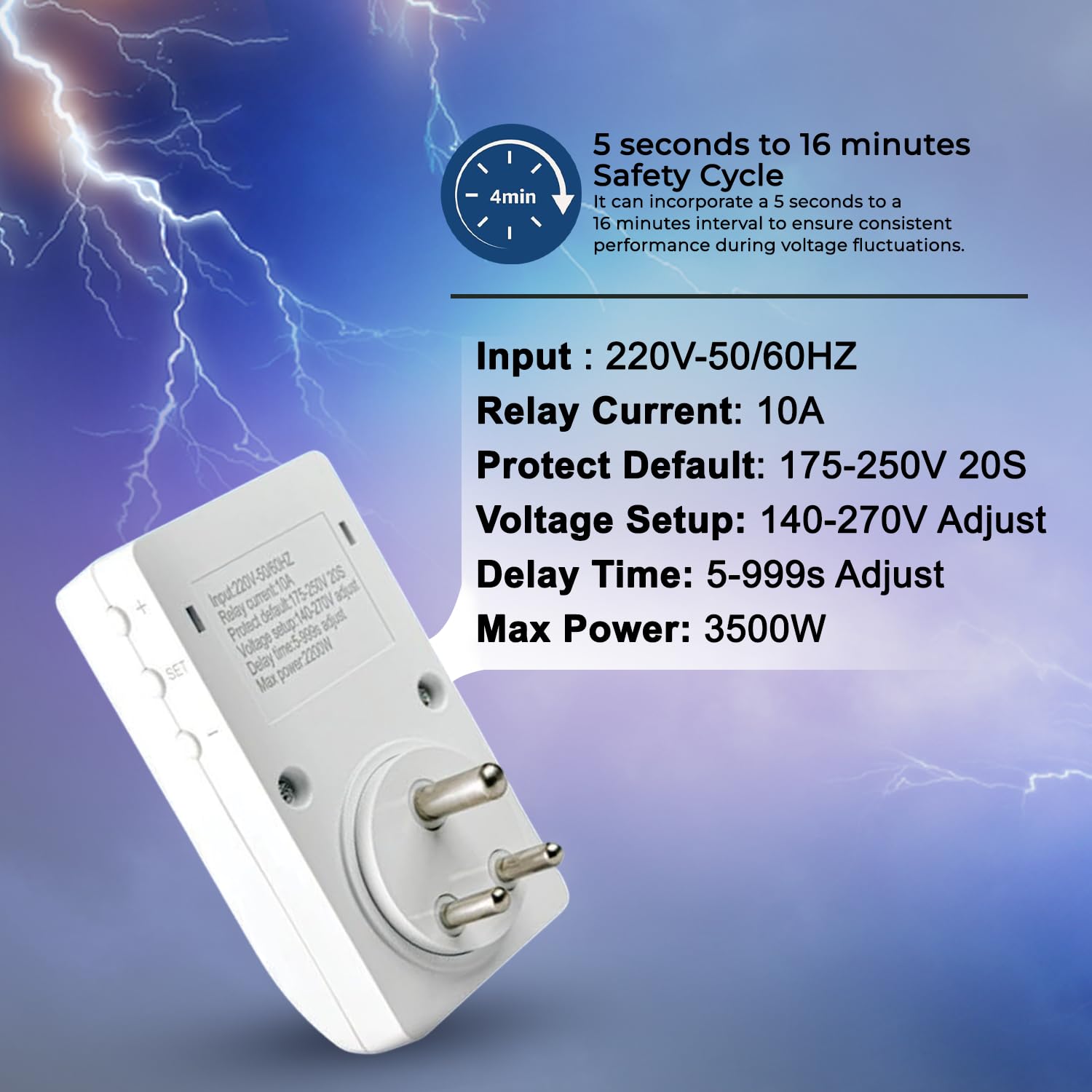 Specifications: Input: 220 V, Relay current: 10A, Protect default: 175-250V, Delay time: 5-999S, Max power: 3500 W, Switch Type: Universal, Plug Type: Indian 3 pin