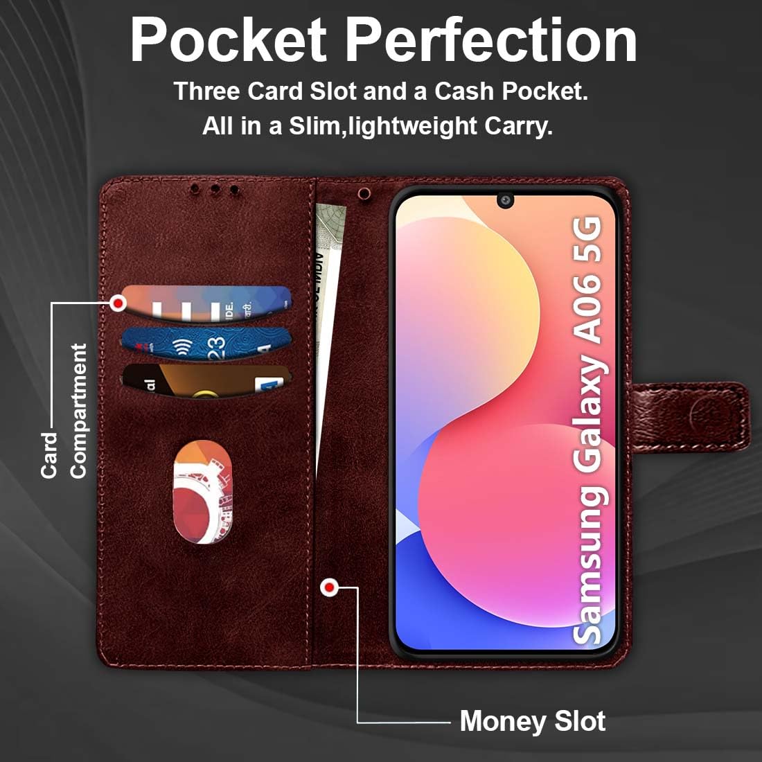 Fashionury Flip Back Case for Samsung Galaxy A06 5G | Designer Button | Genuine Leather Finish | Inbuilt Pockets & Stand | Flip Cover Back Case for Samsung Galaxy A06 5G (Brown)