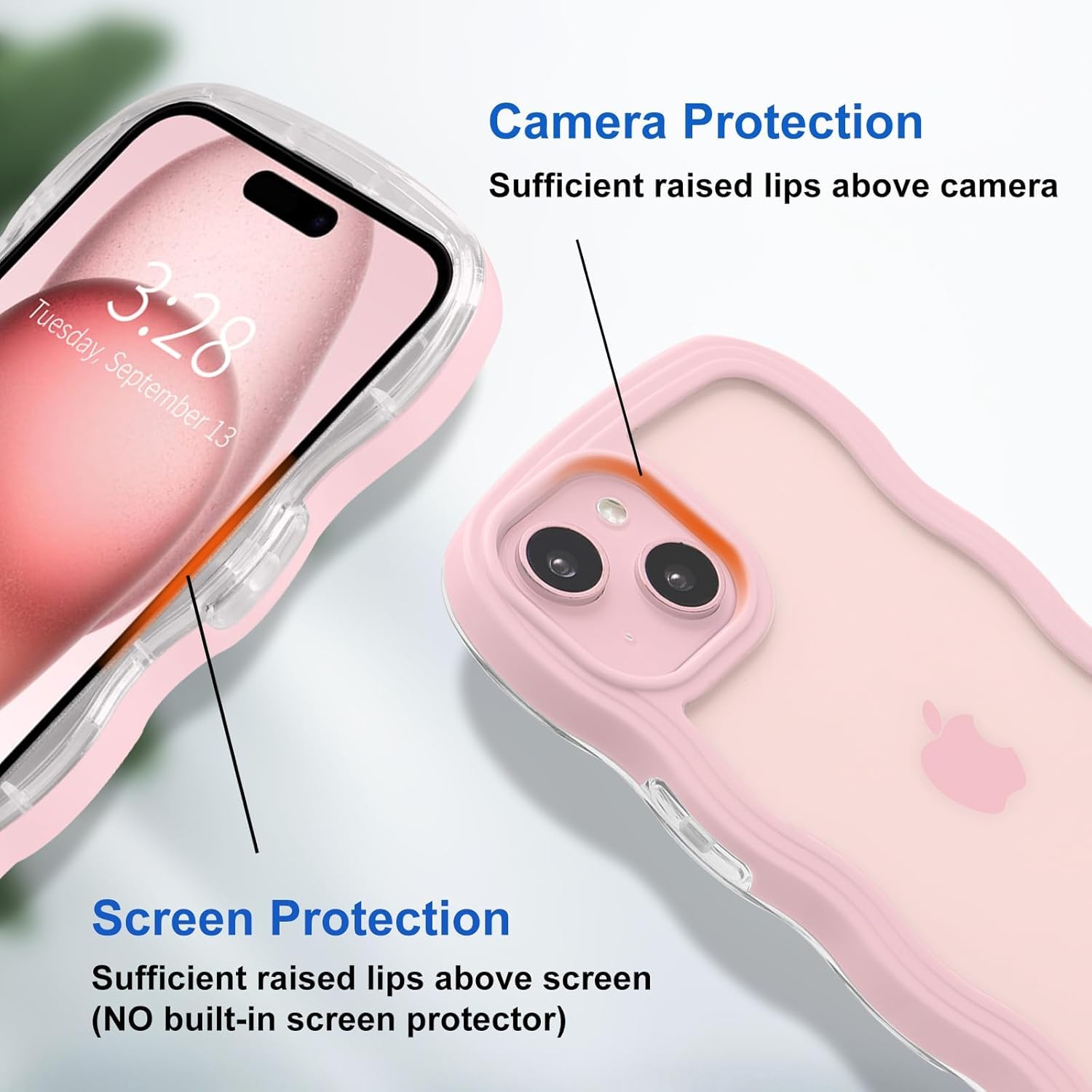 _Clear Back & Wavy Edge_This trendy phone case is clear so that it can show off the color of your iPhone 15, and the case has a cute wavy edge, so it helps with the grip and comfortable to hold