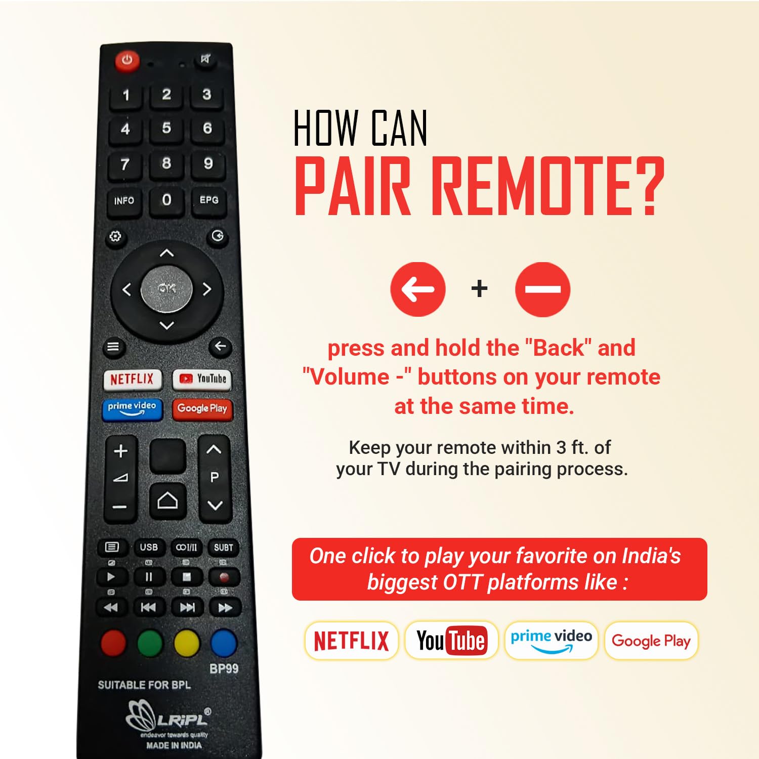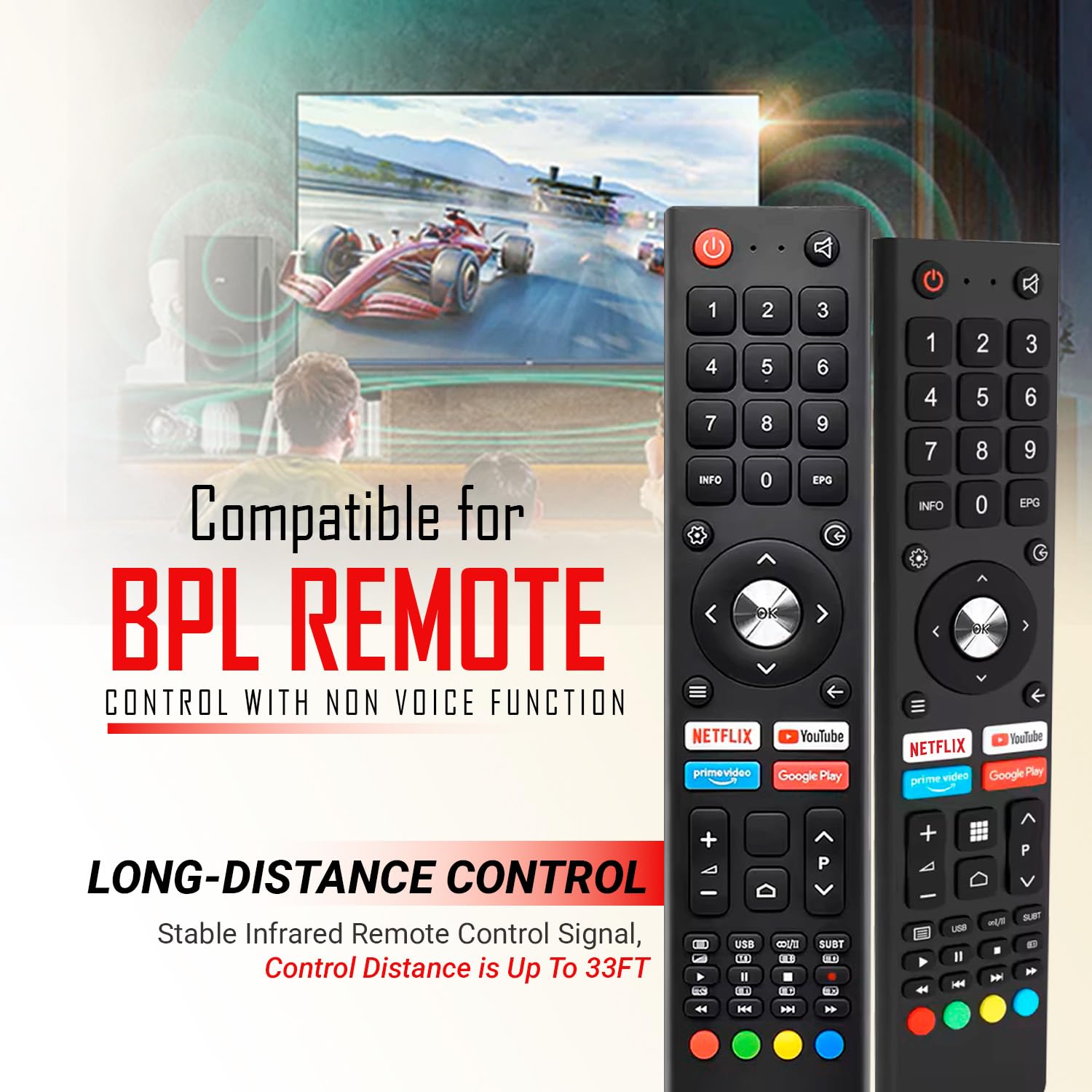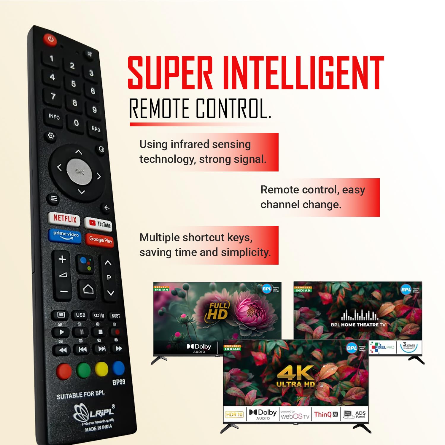 SMART FEATURES: Android TV interface support with intuitive controls for enhanced user experience.Quick Response Performance: This is the latest infrared/voice function remote control for BPL LED TVs, BPL Smart TVs, and BPL LCD TVs. It delivers fast and accurate response within just 0.5 seconds, ensuring a smooth TV control experience. With a strong infrared signal range of up to 10 meters (32 feet), you can enjoy seamless operation from anywhere in the room. Simply insert the batteries and it is ready to use, no setup required.