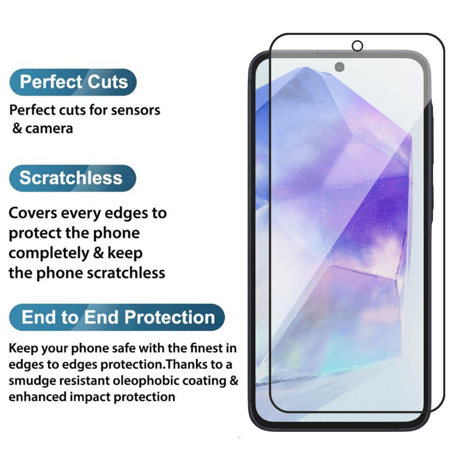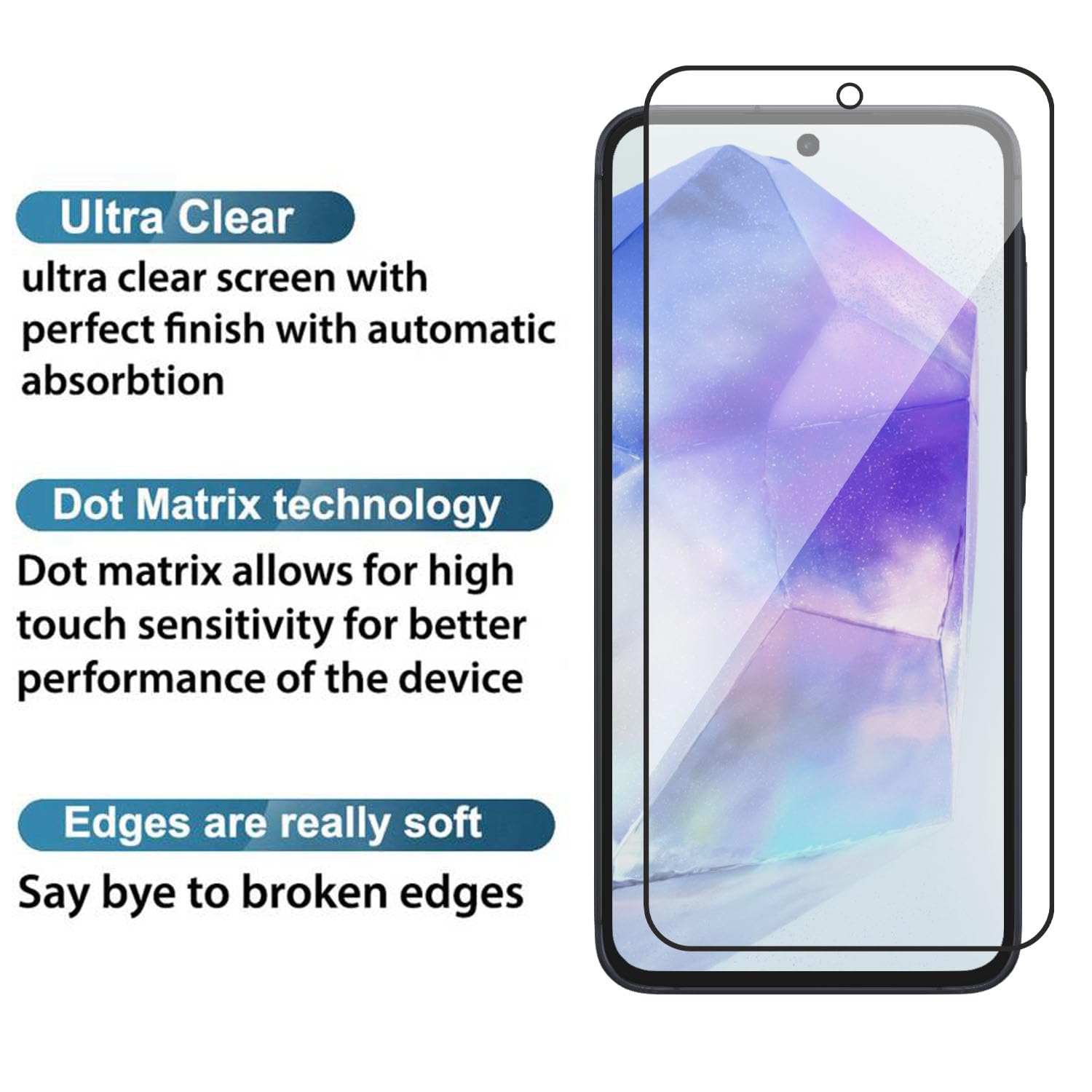 [Benifits]Reliable Protection from Drops. Reliable Protection from Scratches. Easy Way to Maximize Resale Value. [Product Features]Anti GlareScratch resistanceBubble free applicationOriginal screen brightnessRounded edges to prevent any cut over your fingerHigh oleophobic coating for antifingerprint propertyExtreme clarity and responsivenessYoutube guided easy installation.[Kit Contains]1 Tempered glass screen protector For Samsung Galaxy A35/A551 Wipes Kit ( Dry & wet wipes)1 Installation Kit (Guide stickers & dust absorbers) Happy Shopping !