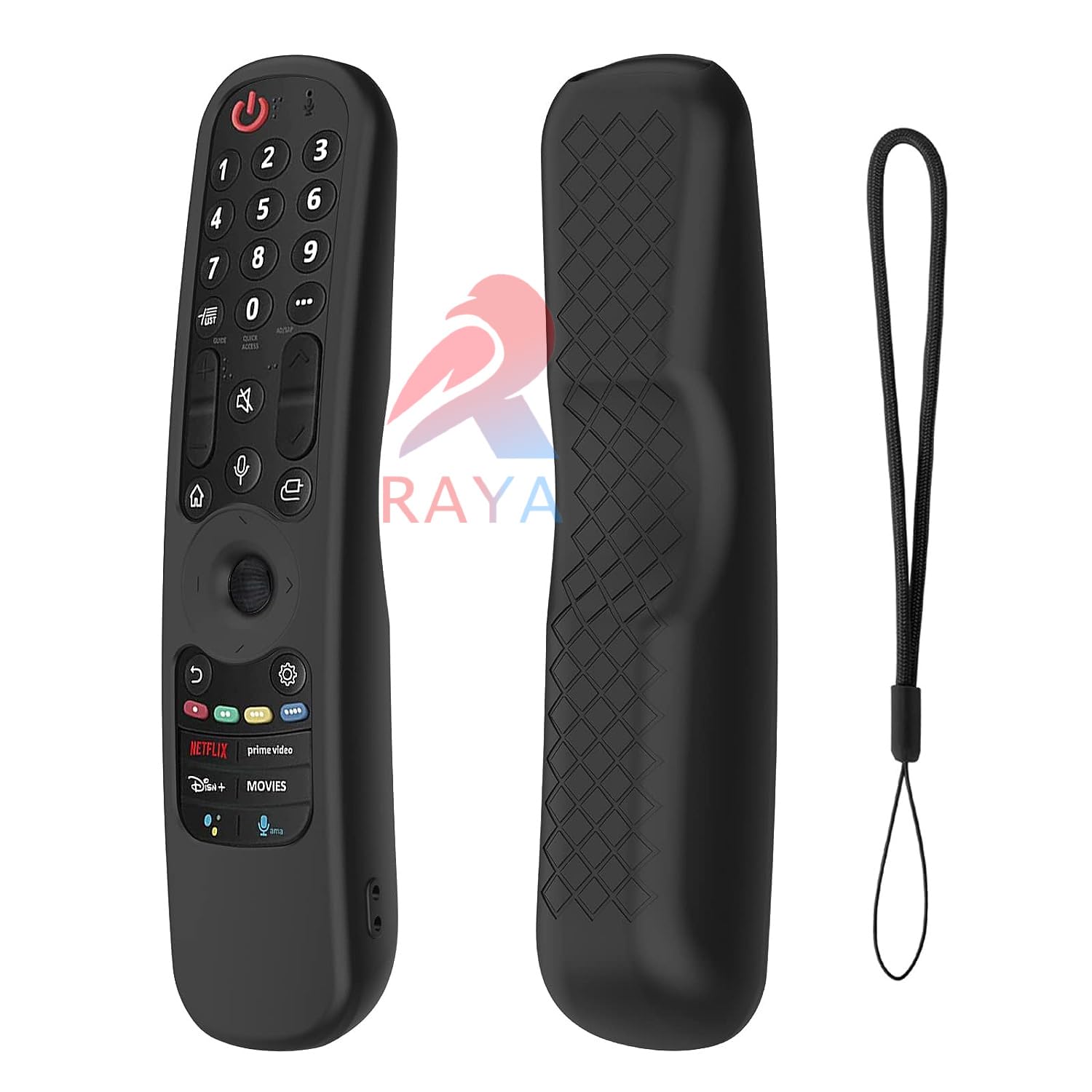 The RAYA Silicone TV Remote Cover is designed specifically for LG Smart TV Magic Remotes, including LG AN-MR21GA (2021) and LG MR22GA (2022) models. Made from premium silicone, this protective cover shields your remote from scratches, dust, and accidental drops while offering a comfortable, non-slip grip for better handling. The case is precision-engineered to provide easy access to all buttons and functions. It also comes with a convenient lanyard, making it easy to carry and store. Lightweight, durable, and stylish, this black silicone cover is a perfect accessory to keep your remote safe and secure. Note: Remote not included.