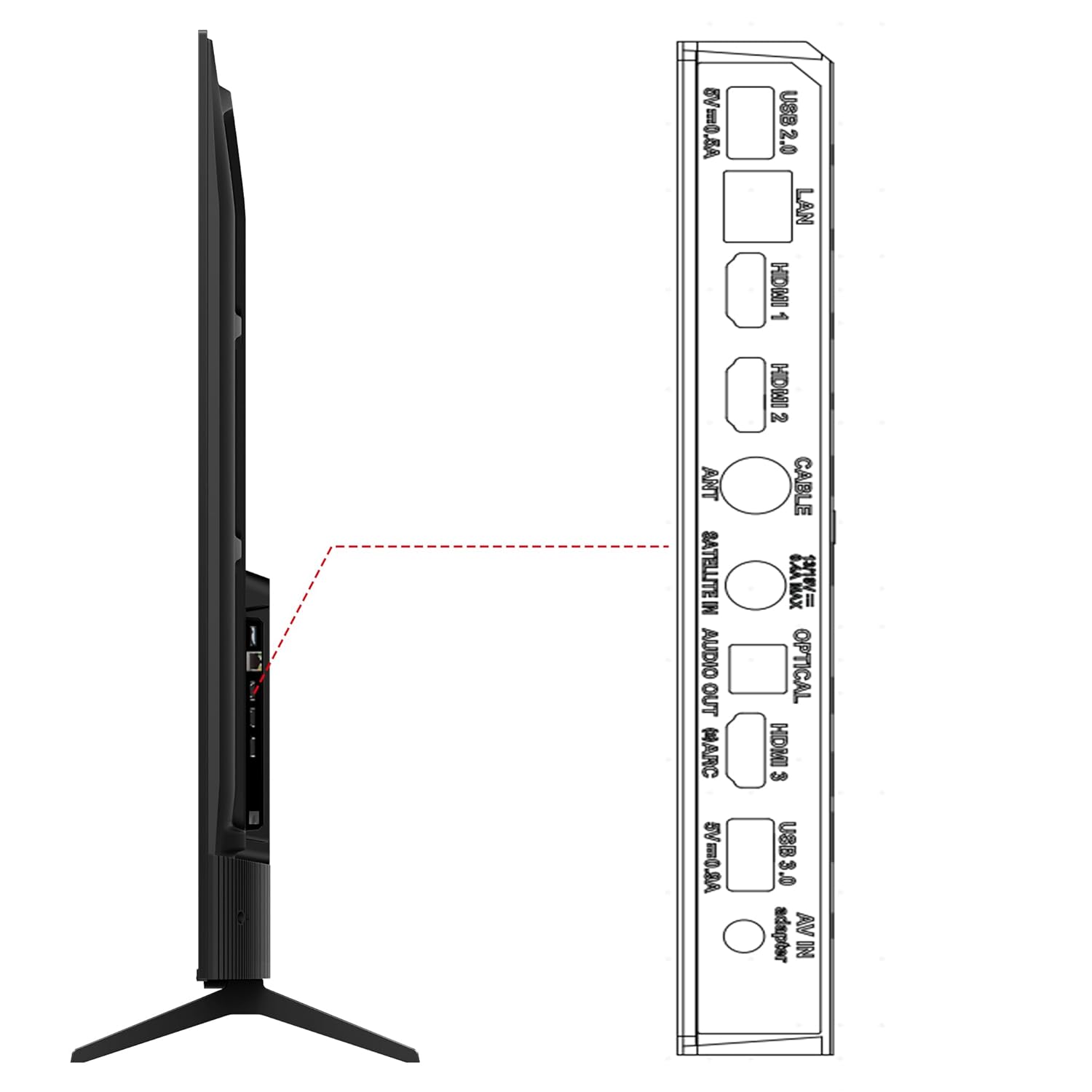 Connectivity: 3 HDMI Ports | 2 USB ports | 1 Lan | 1 Satellite Input | 1 Optical Audio Out | 1 AV IN Adapter