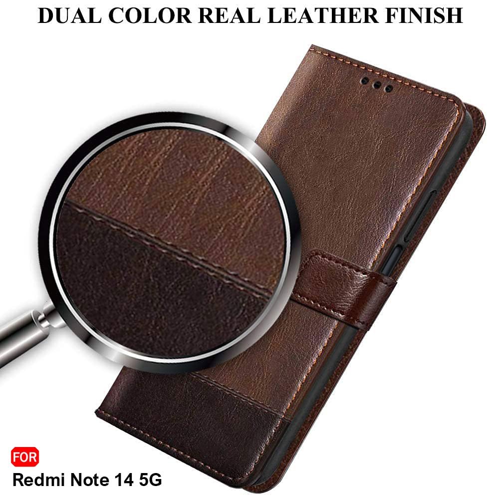 TheGiftKart Flip Back Cover Case for Mi Redmi Note 14 5G | Dual-Color Leather Finish | Inbuilt Stand & Pockets | Flip Back Case Cover for Redmi Note 14 5G (Faux Leather, Brown & Coffee)