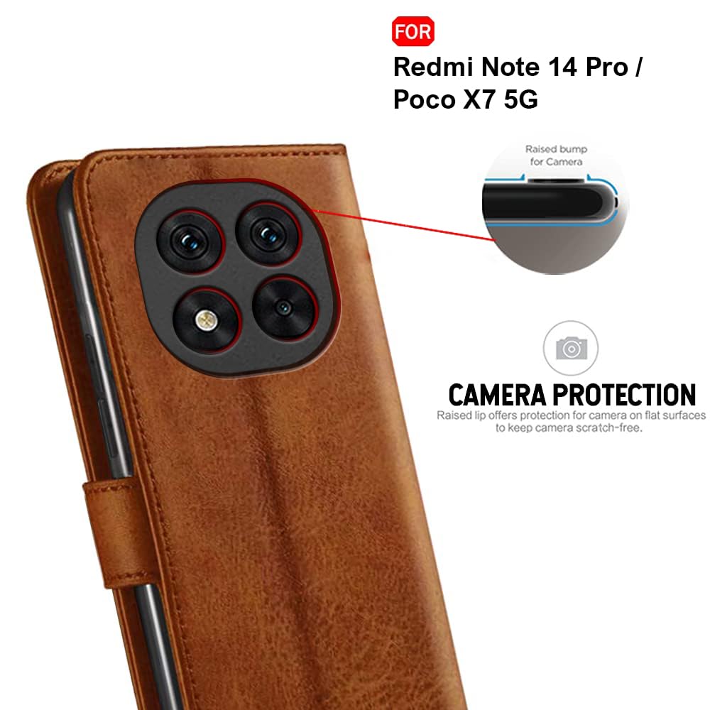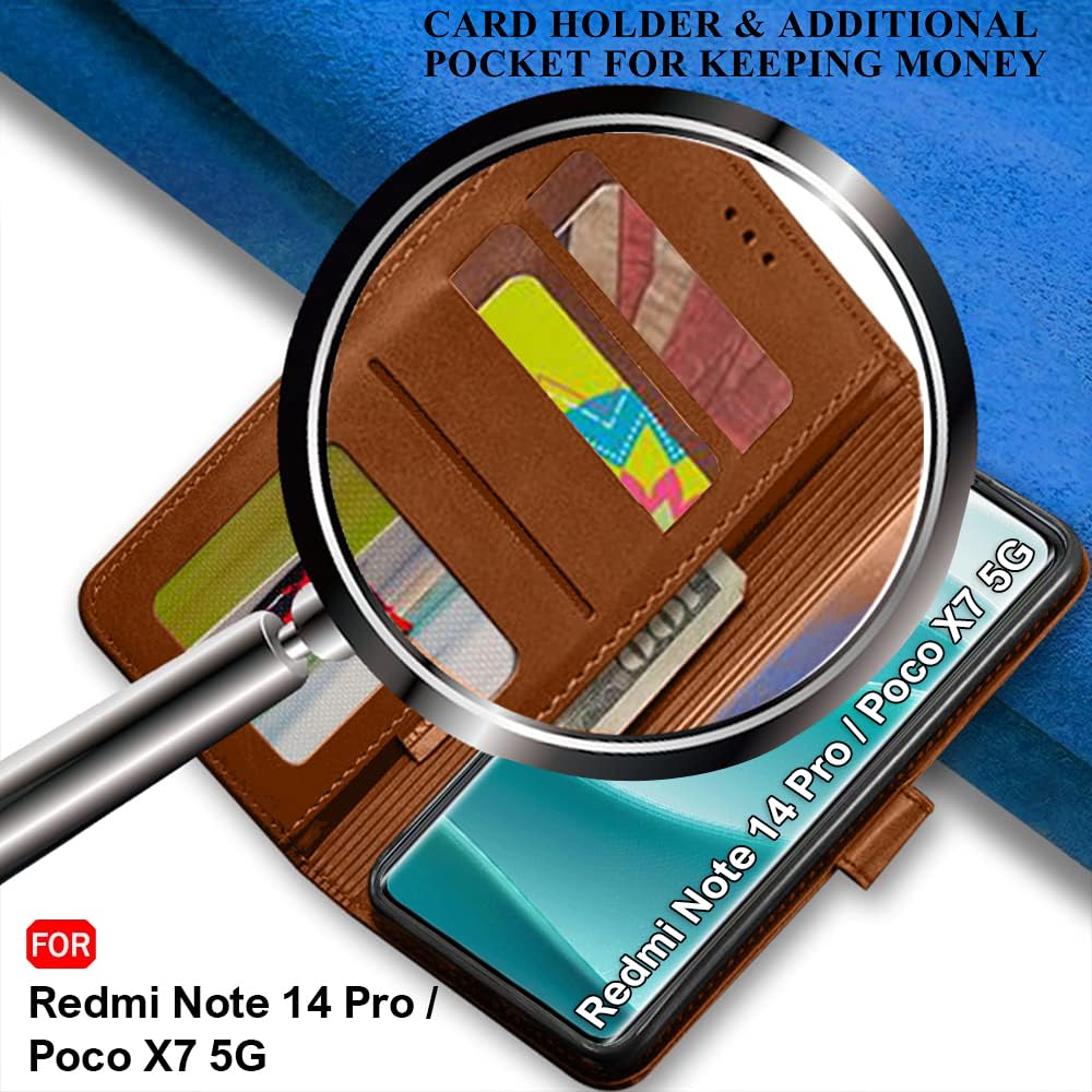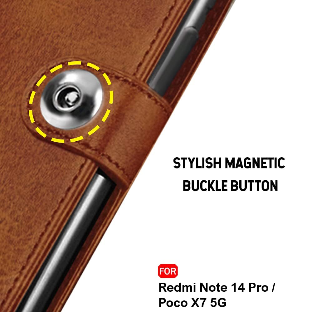 TheGiftKart Flip Cover Back Case for Mi Redmi Note 14 Pro/Poco X7 5G | Genuine Leather Finish | Designer Button | Inbuilt Pockets & Stand | Flip Back Case for Redmi Note 14 Pro (Faux Leather, Brown)