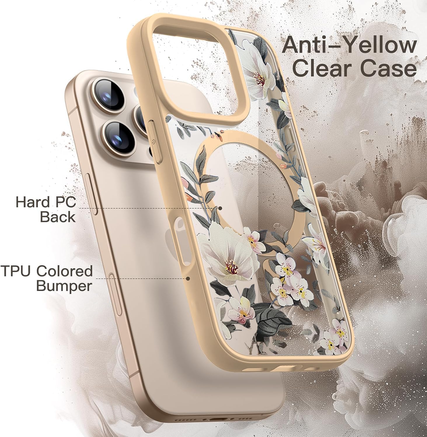 VONZEE Compatible with iPhone 15 Pro Max Case Luxury Retro Flowers Floral Clear for Magnetic Wireless Charging Case Shockproof Case PC+TPU Cute Glossy Shiny Cover for Girls Women,6.7” Desert Titanium