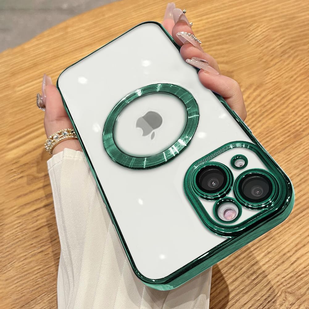 VONZEE Thermoplastic Polyurethane Electroplating Transparent Clear Logo Cover TPU Case For iPhone 15 Case 6.1 Inch,For Magsafe,Full Body&Individual Camera Protection For Each Lens For Men&Women(Green)